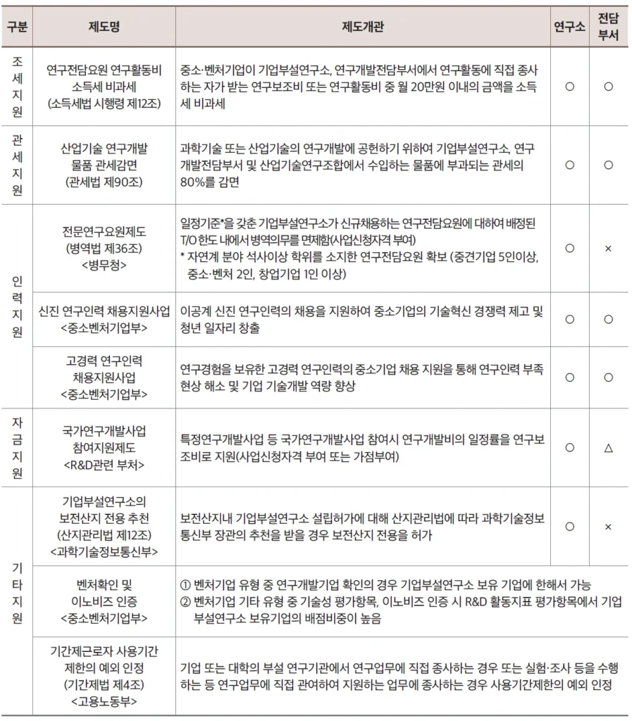 기업부설연구소 및 연구개발전담부서 신고에 관한 업무편람에서는 다양한 지원제도를 정리하고 있다.